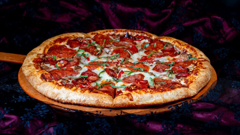 - Haunted Heatwave Pizza: Spiced blush sauce topped with mozzarella and pepper jack, Italian sausage, classic and crispy cupped pepperoni, smoked bratwurst, and sliced red Fresno chiles garnished with basil and hot honey drizzle (Available Aug. 22 through Oct. 31) (New)
